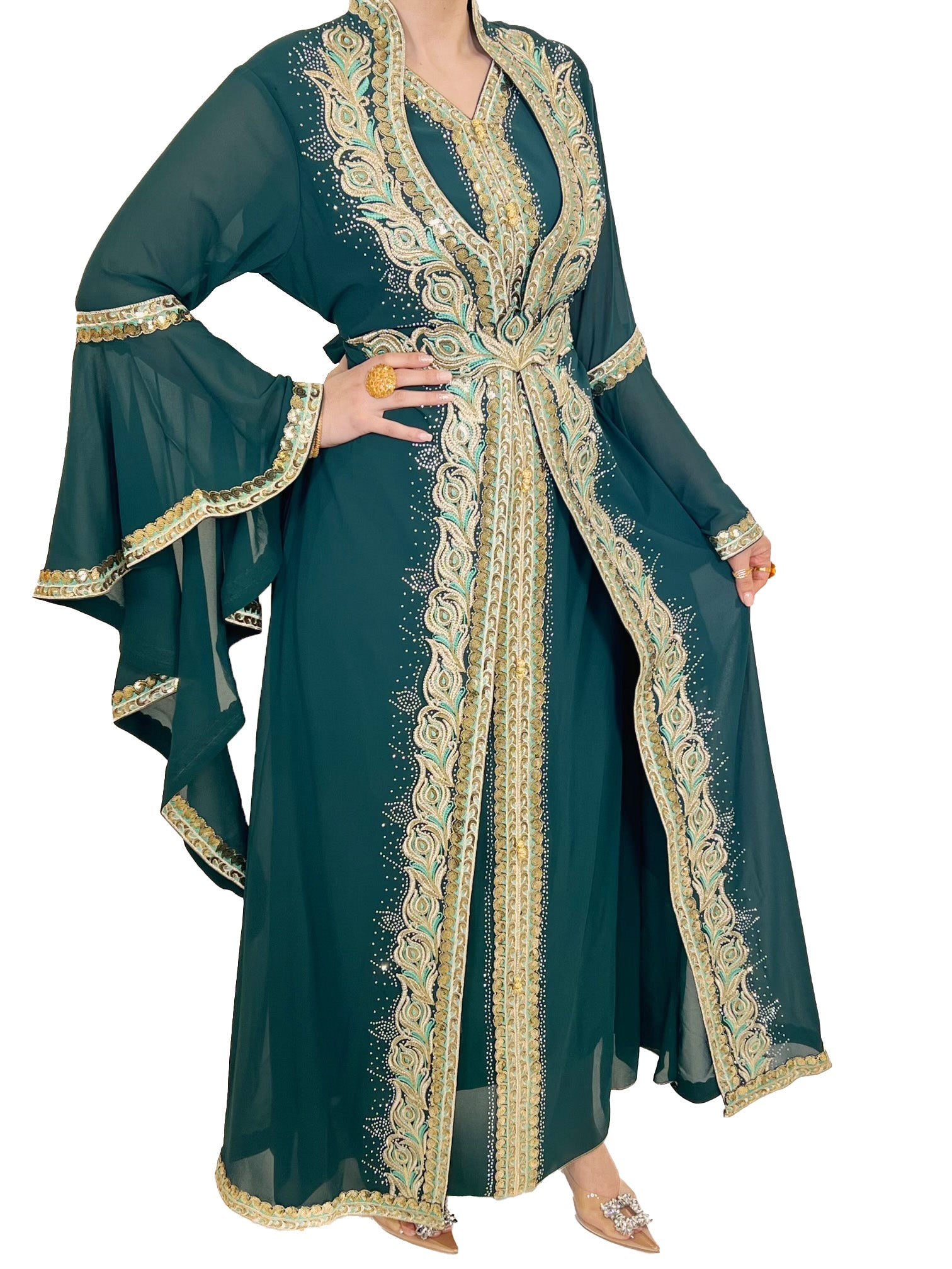 Diana caftan is a statement of elegance .A captivating blend of Arabian charm and contemporary allure, while the detailed embellishments add a touch of grace and uniqueness. This kaftan is designed to make you stand out with timeless style.