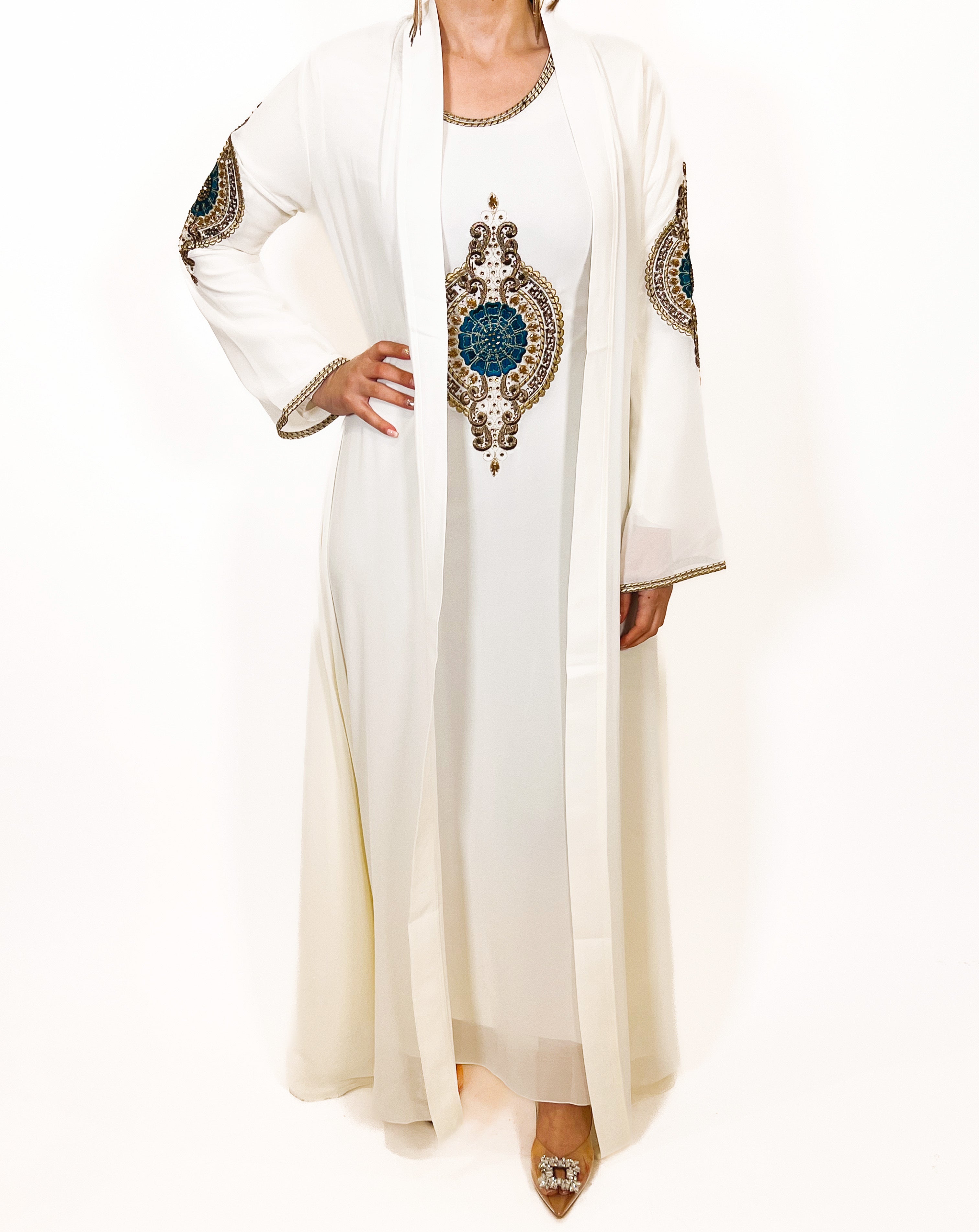 Introducing the Huda Abaya with Detailing – a fusion of purity and elegance that captures the essence of timeless style. Immerse yourself in the pristine allure of white, adorned with exquisite coloured detailing. Named "Huda," meaning "guidance" in Arabic, the perfect blend of modesty and fashion