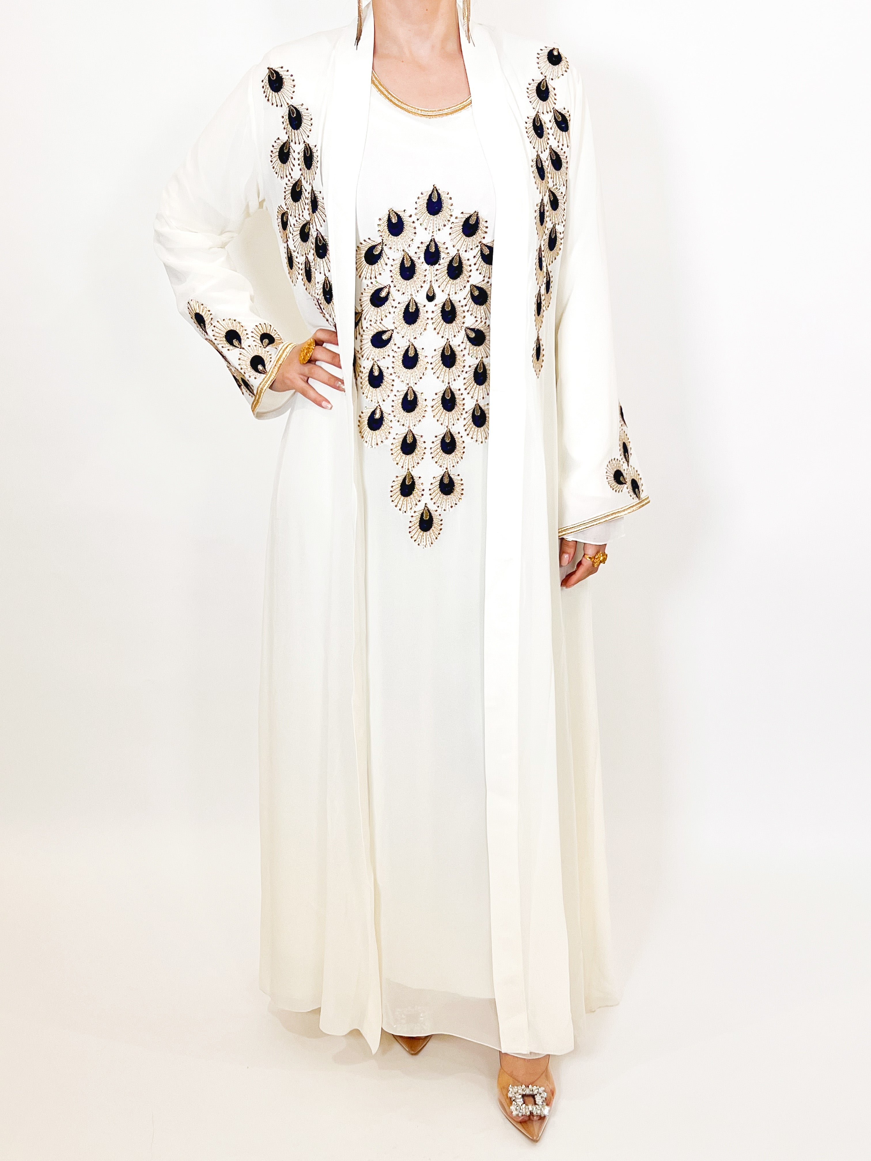 Introducing the Huda Abaya with Detailing – a fusion of purity and elegance that captures the essence of timeless style. Immerse yourself in the pristine allure of white, adorned with exquisite coloured detailing. Named "Huda," meaning "guidance" in Arabic, the perfect blend of modesty and fashion